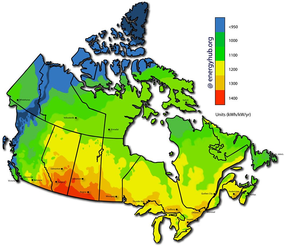 - The capability of solar panels to generate electricity is expressed as Solar Production Potential Source. The potential varies widely across Canada with Saskatchewan and Alberta having the highest values. The map at right shows the potential across Canada in Kwh/Kw/yr.